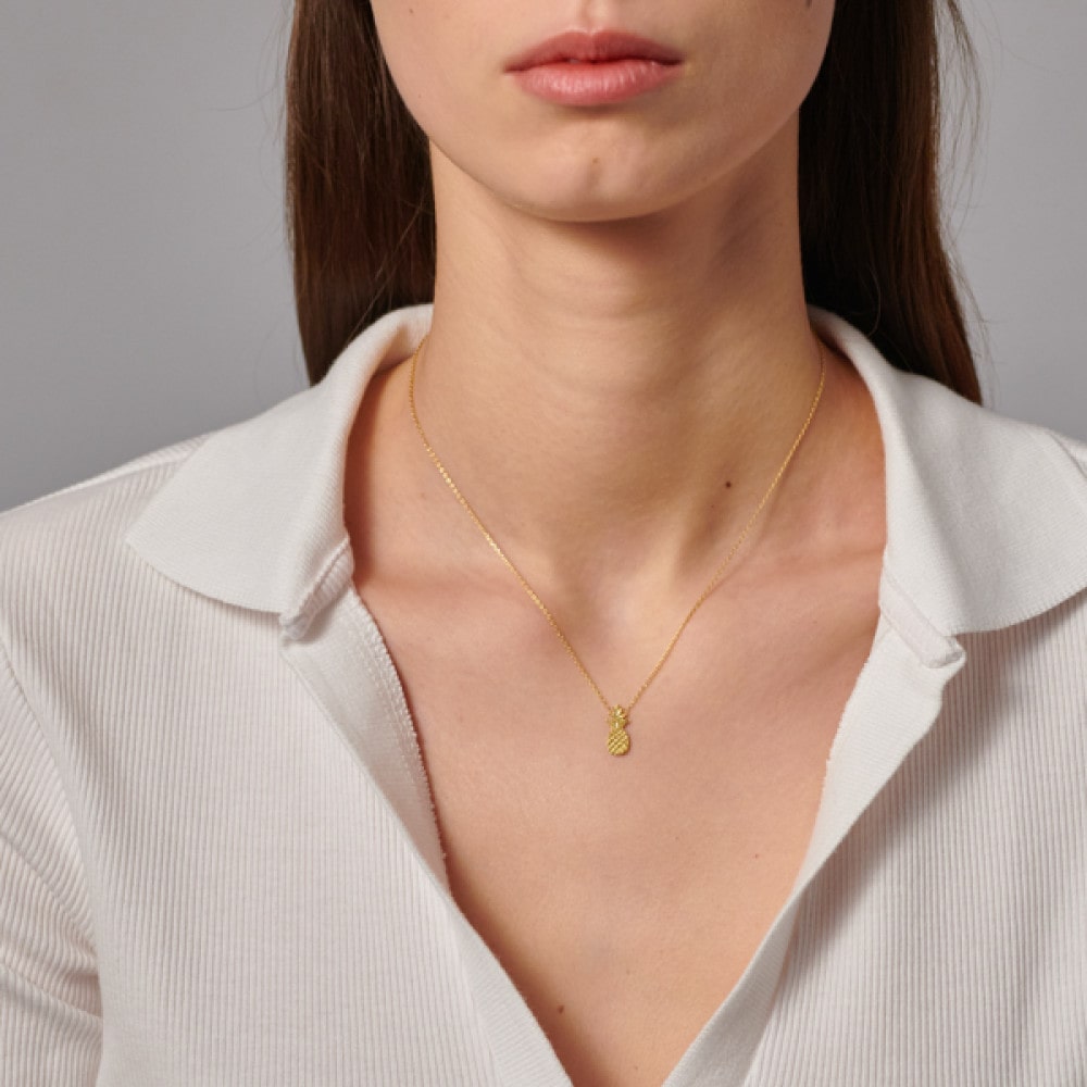Aggiungi un tocco di sole e vitalità alla tua collezione di gioielli con questa splendida collana a forma di ananas. Perfetta per esprimere la tua personalità solare e il tuo amore per l'estate.
